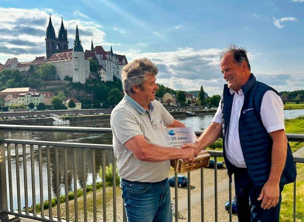 Zur Würdigung dieser langjährigen, zuverlässigen und qualitativ hochwertigen Ausbildung überreichte Sven Greif, Präsident des DMYV-Landesverbands Sächsischer Motorwassersportverband, dem Inhaber Andreas Bönisch feierlich das Schild für die Auszeichnung der ausgezeichneten Zusammenarbeit über ein Viertel Jahrhundert, sowie eine Präsentkiste mit Spezialitäten vor der imposanten Kulisse des gemeinsamen Heimatreviers Elbe und der Meißener Albrechtsburg.