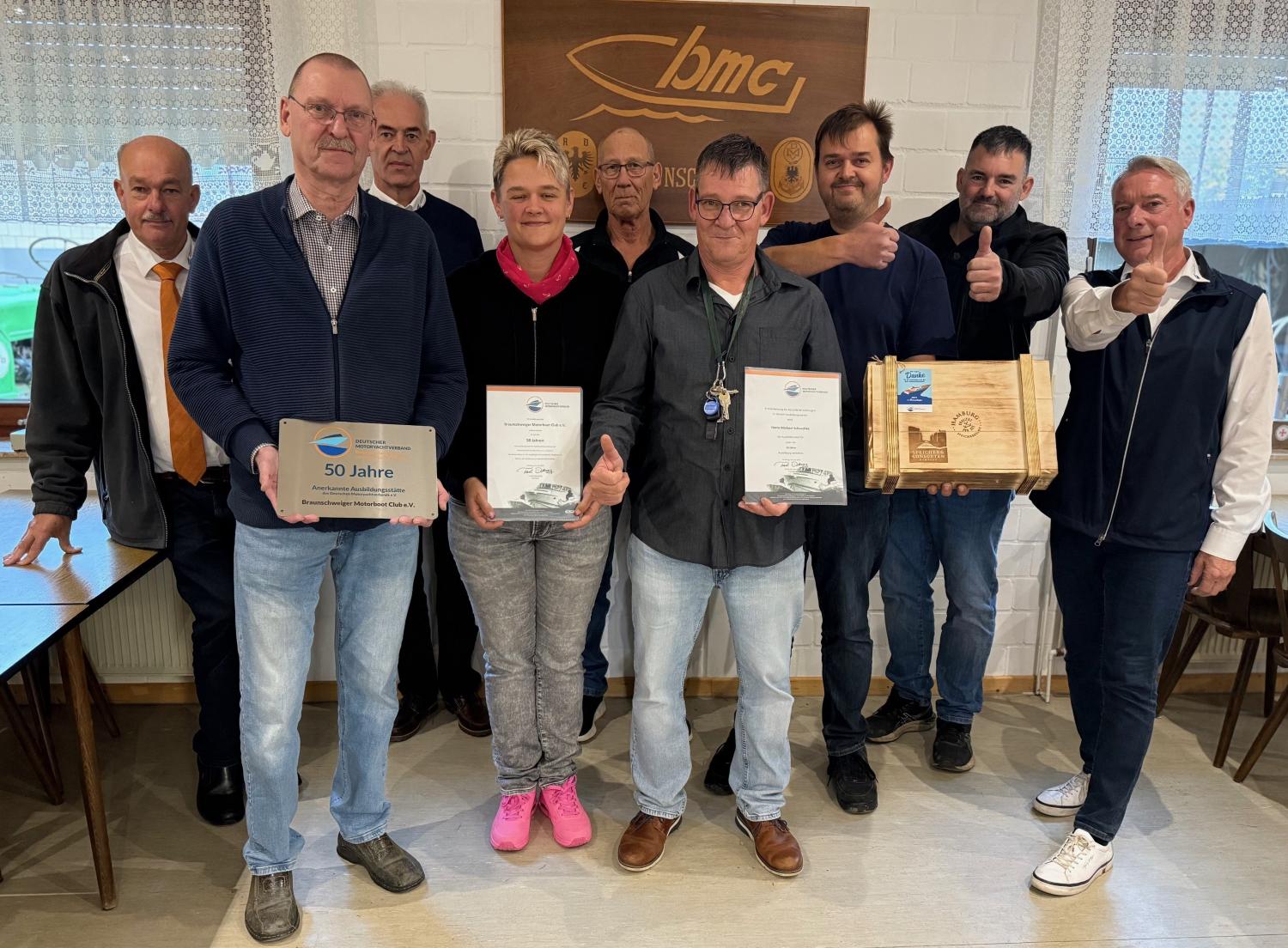Dirk Hartung vom Referat Ausbildungsstätten DMYV überbrachte dem Verein die Grüße und Glückwünsche vom Präsidium des DMYV. Im Anschluss wurde dem 1. Vorsitzenden des Vereins, Herrn Michael Schuschke, die Urkunde des DMYV für die 50-jährige Anerkennung als Ausbildungsstätte mit einem Banner, einer Tafel 50 Jahre „Anerkannte Ausbildungsstätte“ des DMYV und eine Spezialitäten-Kiste von Speicher & Consorten aus Hamburg überreicht. Zudem erhielt Michael Schuschke für seine zehnjährige erfolgreiche Tätigkeit als Ausbilder für den BMC die Ausbilder-Nadel und Urkunde des DMYV überreicht.
