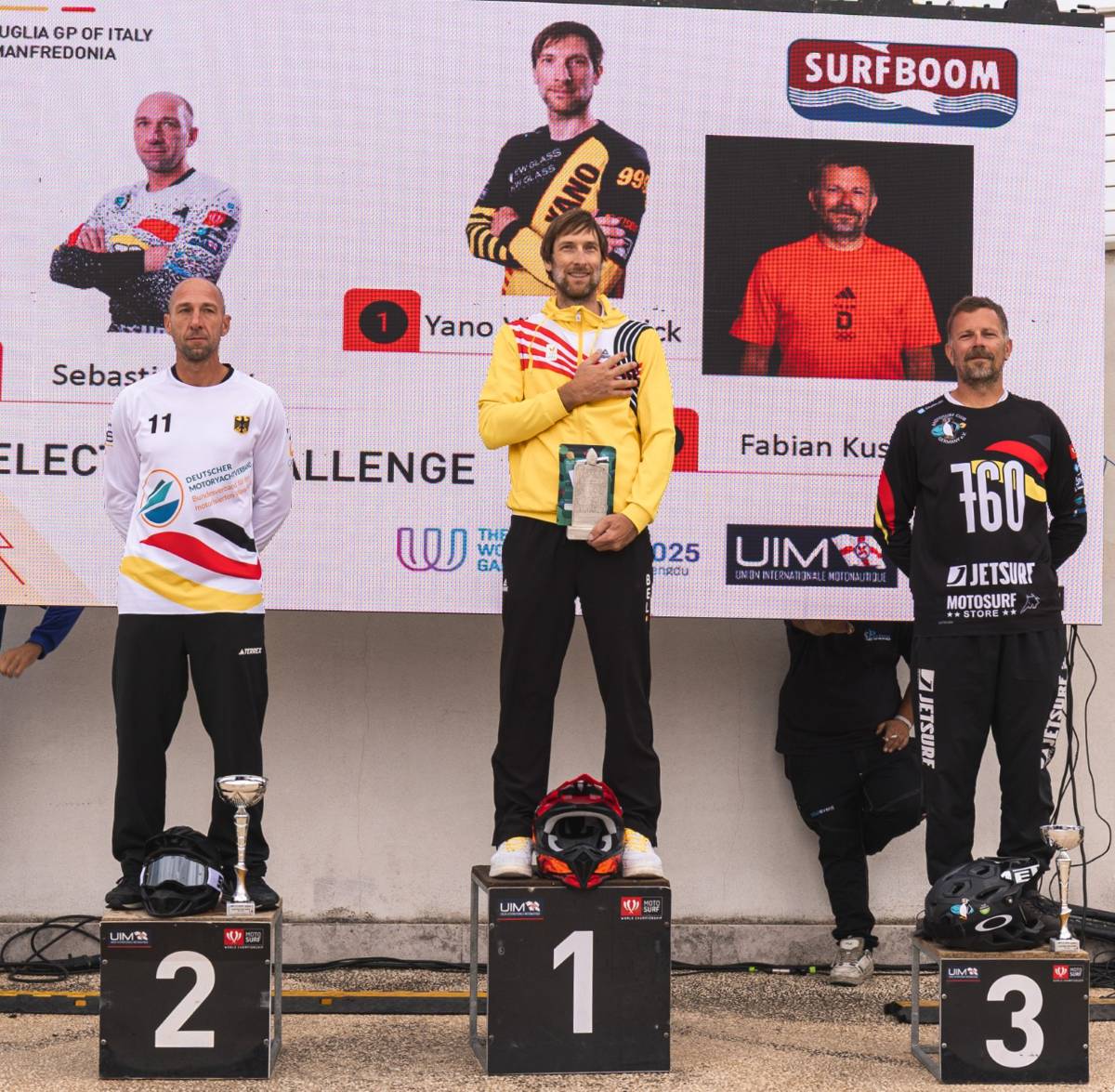 Beim Rennen im italienischen Manfredonia (3.–5. Oktober) sorgten Sturm, starke Strömungen und hoher Wellengang zunächst für eine Startverzögerung. Nach einer Wetterbesserung konnte der Wettbewerb fortgesetzt werden, und das vom MotoSurfClub Germany betreute Team zeigte eine herausragende Leistung: In der Kategorie Electric belegte der Belgier Yano Vankersbilck Platz eins, gefolgt von den deutschen Fahrern Sebastian Lux und Fabian Kusche. Damit stellten die Racing Penguins das komplette Podium. In der Masters-Kategorie erreichten Lux und Vankersbilck zudem respektable Platzierungen auf den Rängen sieben und neun.