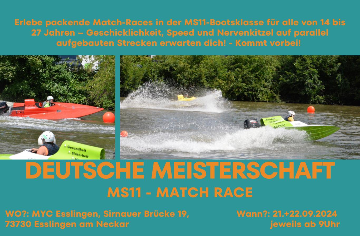 Am Wochenende vom 21.-22. bis September erwarteten die Zuschauer und Teilnehmer der Deutschen Meisterschaft in der beliebten Jugend-Rennbootklasse MS11 packende Match Races, Geschicklichkeit, Bootsbeherrschung, Speed und jede Menge Spaß. Nach dem K.O. Prinzip fuhren immer zwei Teilnehmer in den schnellen und wendigen Dreikantpfeilen, die von 15 PS-Außenbordern angetrieben werden, auf parallel ausgelegten Slalom-Kursen ihre Rennen bis die Deutsche Meisterinnen und Meister feststehen.
