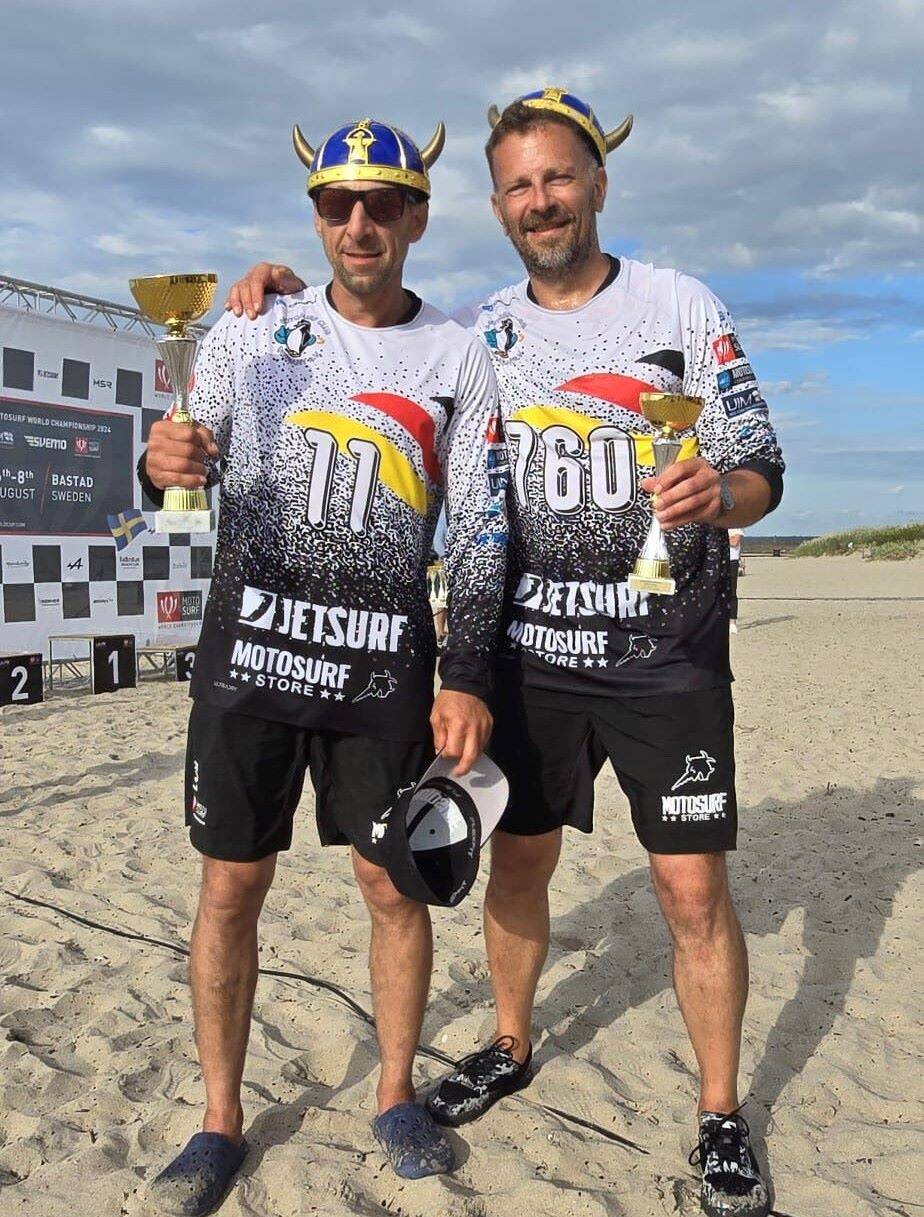 Deutsche Wikinger auf Jetsurfboards: Sebastian Lux (li) konnte sich in der Klasse Electric auf Rang 2 vor seinem Clubkameraden Fabian Kusche platzieren. (Foto: Motosurf World Chamoinship)