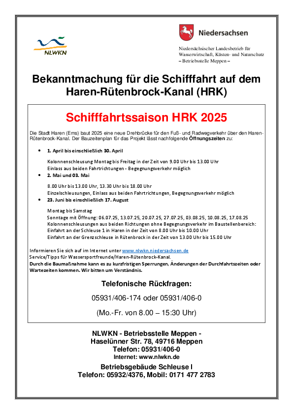„Anders als aufgrund der Bauarbeiten zunächst befürchtet bleibt der Kanal in diesem Jahr für Boote nutzbar. Wir wollen mit den neuen Öffnungszeiten sowohl einen reibungslosen Ablauf der Bauarbeiten ermöglichen als auch die Sicherheit der passierenden Boote gewährleisten“, erklärt Josef Schwanken, Geschäftsbereichsleiter in der NLWKN-Betriebsstelle Meppen.
