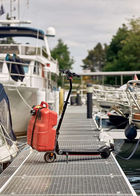 Der Moovi-Roller ist ein praktischer Helfer für den Bordalltag und eignet sich hervorragend für verschiedene Transportaufgaben, sei es der Weg zum Bäcker, der Einkauf im Supermarkt oder das Befördern von Spritkanistern und anderen schweren Lasten bis zu 40 Kilogramm direkt bis ans Boot.
