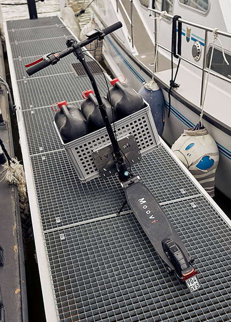 Ein Highlight des Moovi E-Scooters ist sein einzigartiges Lastensystem, das den Scooter zum idealen „Lastesel“ im Bordalltag macht. Die Universalhalterung, die schnell und einfach und lenkungsunabhängig am Roller befestigt werden kann, ermöglicht den Transport von Lasten bis zu 40 kg an der Vorderachse. Verschiedene Transportteile können an die Halterung angeschlossen werden, sodass sich der Moovi individuell an unterschiedliche Bedürfnisse anpassen lässt.